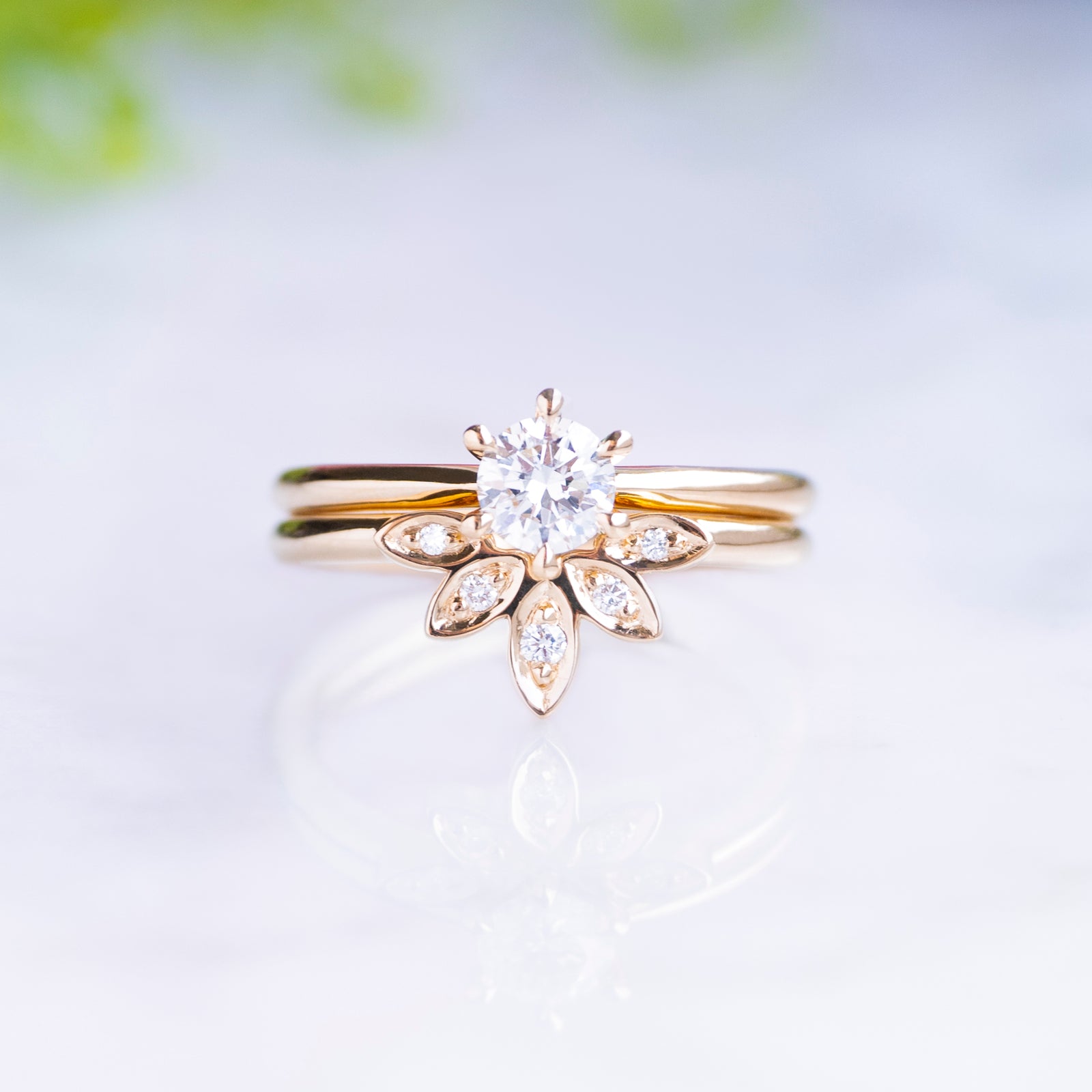 The Eirora Garland Ring is a tribute to the serene beauty of the now. Three glowing blossoms bloom across the band: the past, the present,...